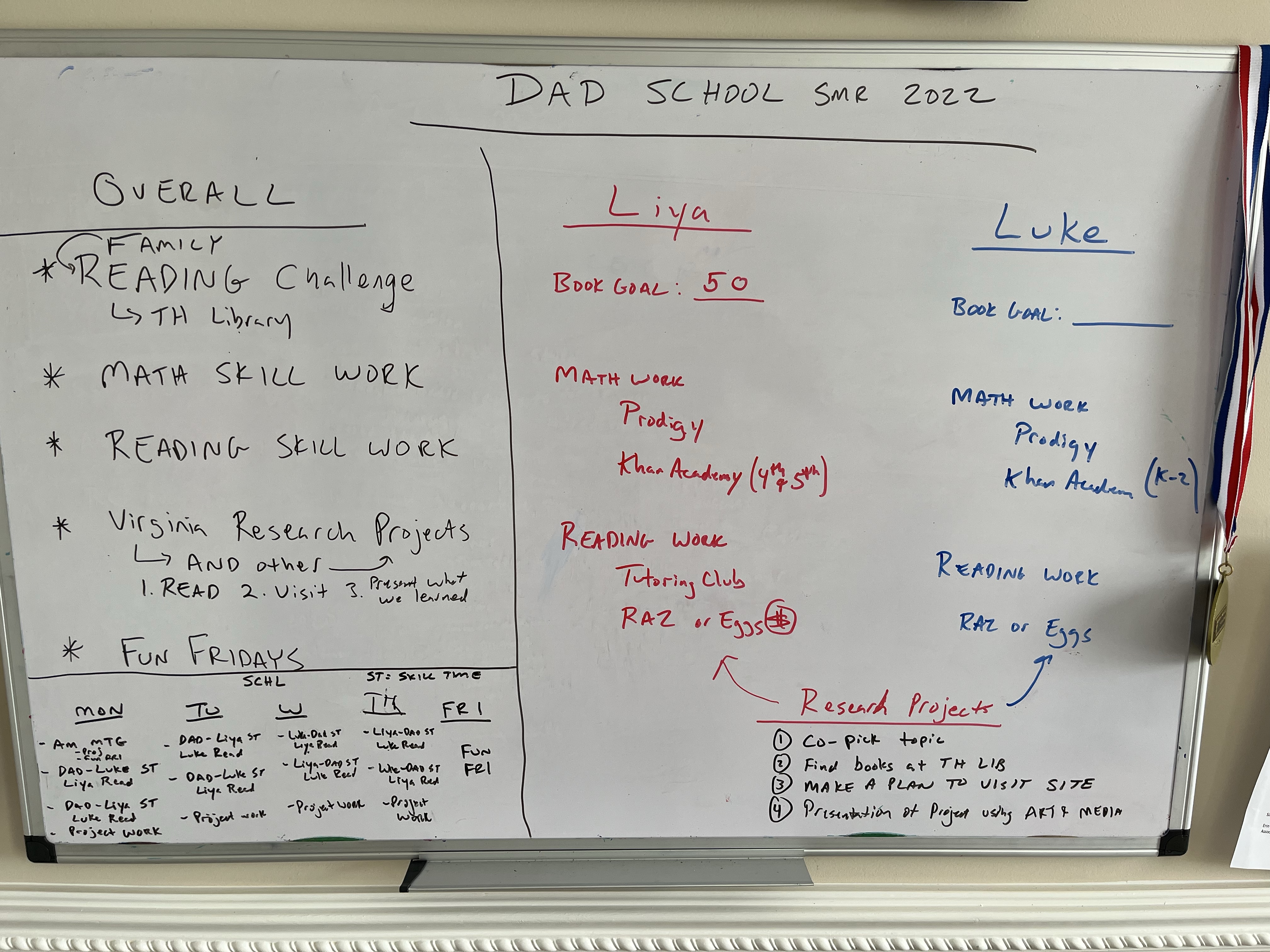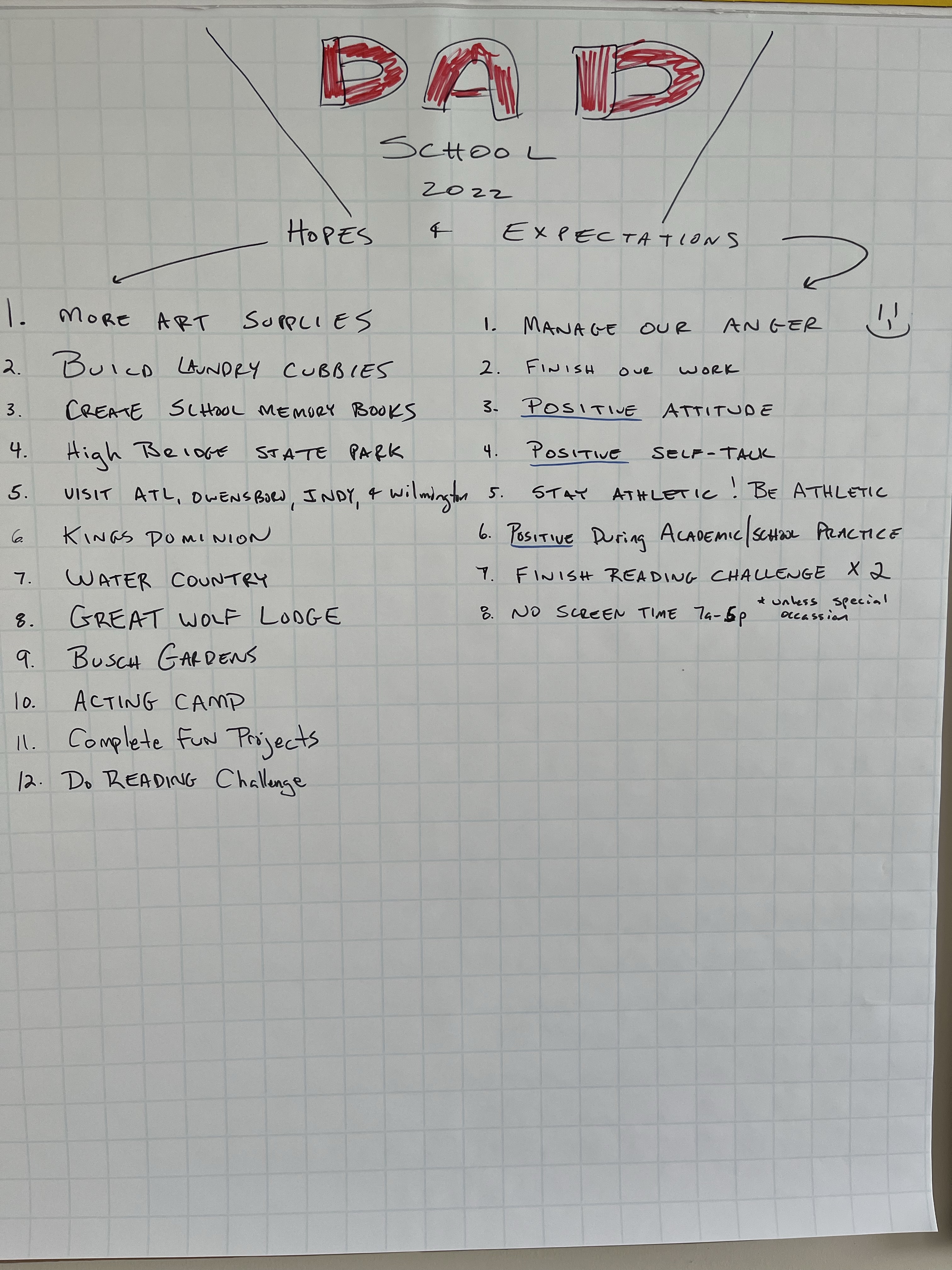 I spent many years (20+) in higher education and so we started off Dad School 2022 by having a meeting to create our expectations and hopes for the summer. We all discussed our expectations of each other and what we wanted to work on from a behavioral standpoint. We also set screen time goals and staying active goals. For hopes, we reviewed what we already have planned, what we hope to plan, and even left room for additional opportunities. We are starting with swim school, drama camp, a reading challenge, and creating a memory book from last school year to kick off our first two weeks. All those years of higher ed taught me you gotta get input, set some goals, allow for flexibility, and lay out how you expect people to act. We certainly have done that here at the #SkillmanPack Dad School.